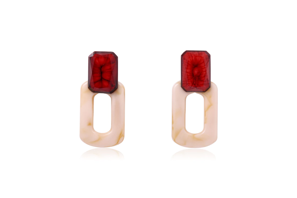 Um brinco que mistura formas retas e tons marcantes com suavidade. A parte superior em resina facetada vinho escuro com leve transparência e efeito craquelado se destaca com sofisticação. A base off-white em formato retangular vazado adiciona leveza e contraste moderno à peça.